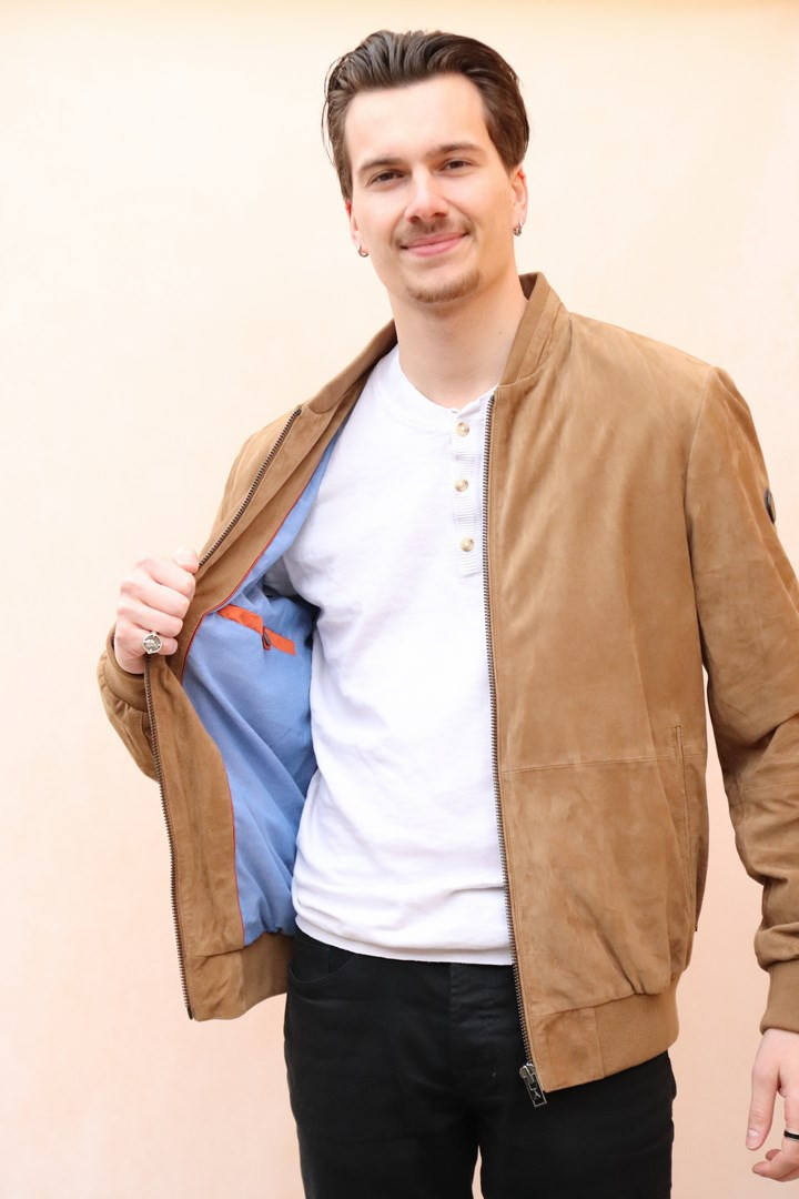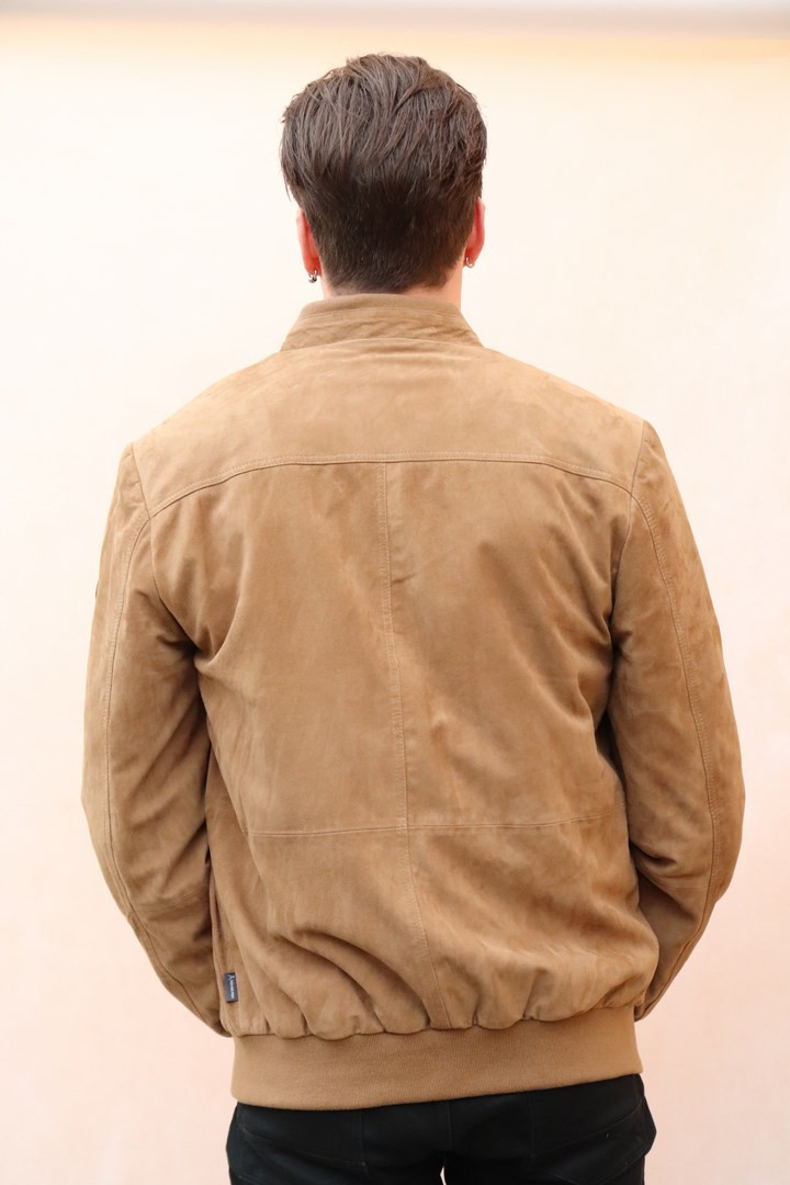 Blouson cuir chèvre velours camel coupe Teddy