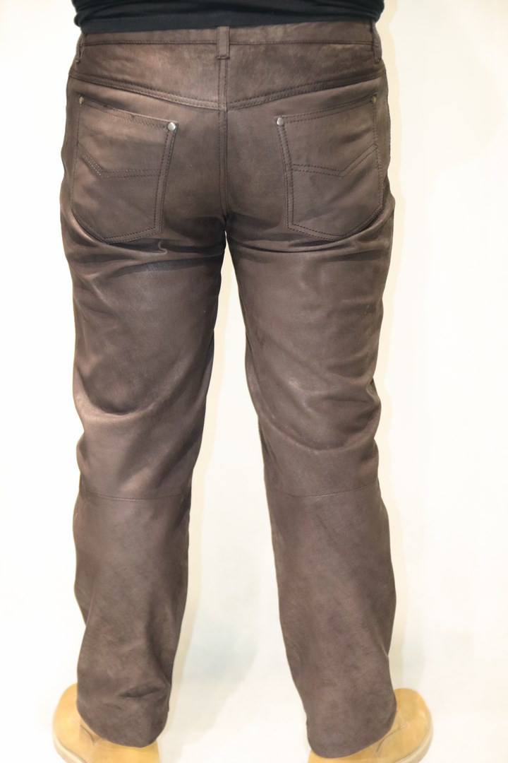 Pantalon cuir homme en agneau très souple marron mat patiné.