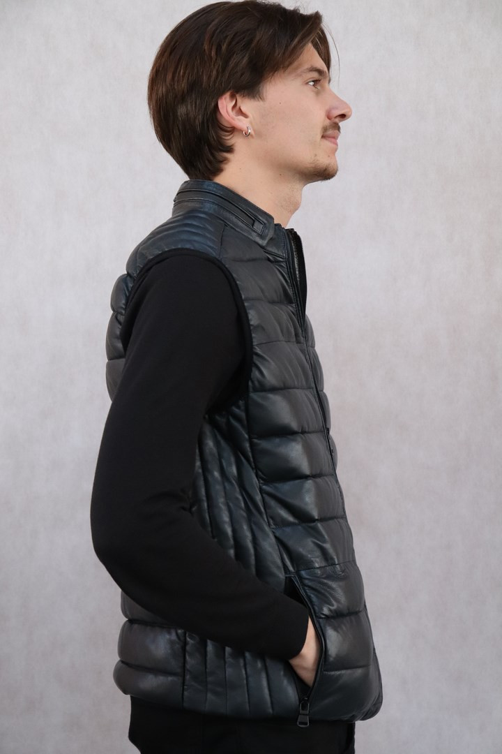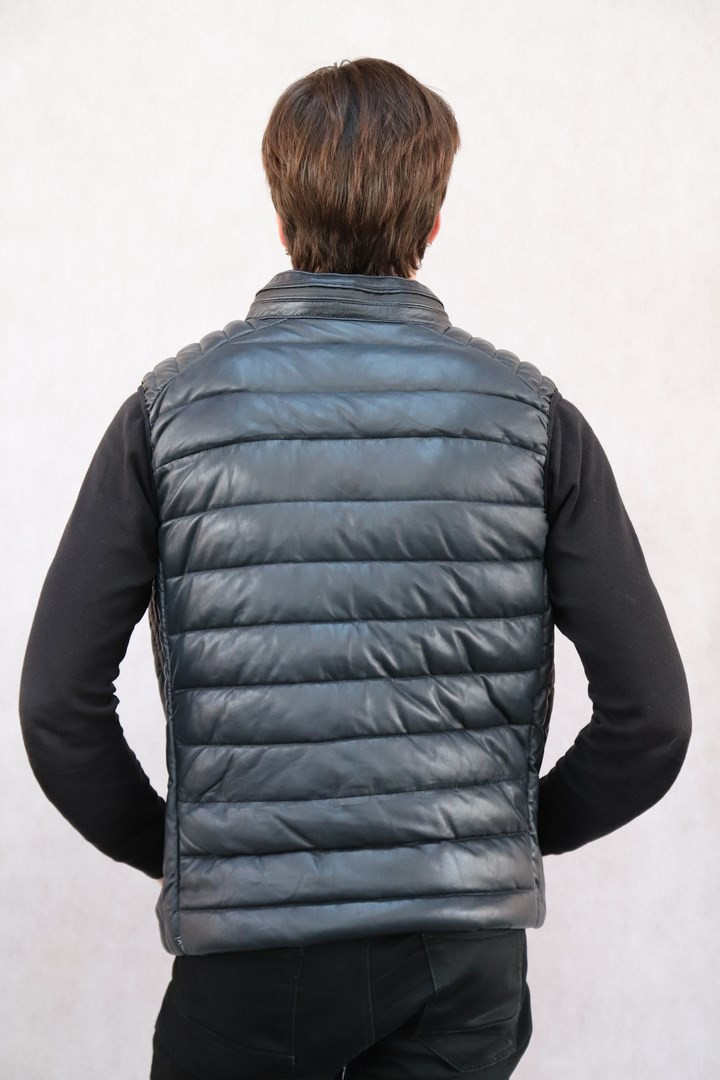 Gilet doudoune cuir agneau bleu marine.